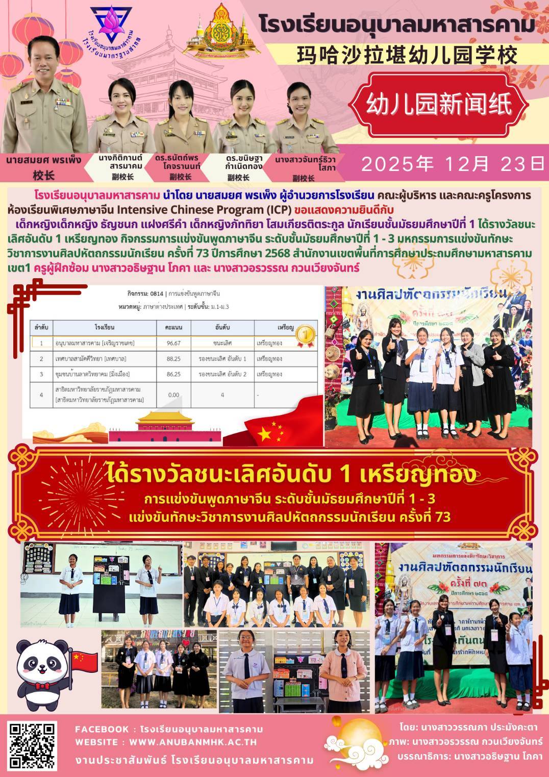 นักเรียนคนเก่งได้รับรางวัลชนะเลิศอันดับ 1 เหรียญทอง กิจกรรมกรรมการแข่งขันพูดภาษาจีน (ระดับชั้น ม.1-3)การแข่งขันทักษาะวิชาการศิลปหัตถกรรมนักเรียน ครั้งที่ 73 ปีการศึกษา 2568